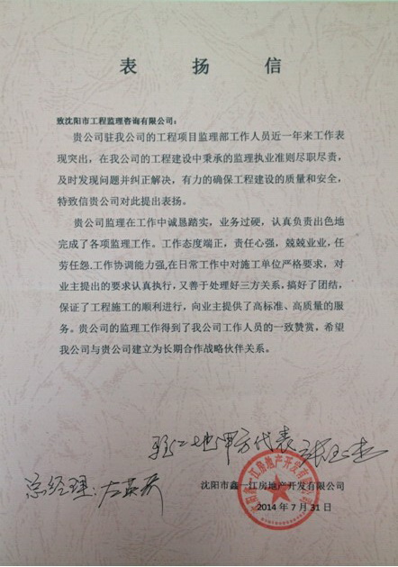 我公司驻龙江苑、柴河家园项目部员工,在区域负责人费坚的带领下,以尽职尽责的工作态度抓质量保安全,以扎实过硬的专业服务赢得了沈阳市鑫一江房地产开发公司的赞赏和表扬,为项目员工赢得了荣誉,为公司赢得良好的业界口碑,更为公司与品牌地产开发商建立长期稳定的合作伙伴关系奠定了良好的基础。