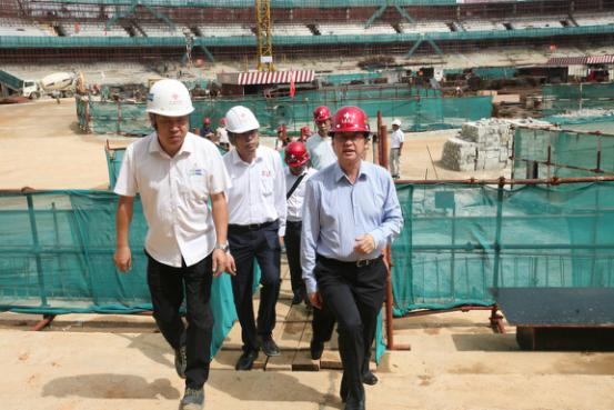 2018年6月29日上午10时,合作局西非处处长张明武、合作局中非处吴帆等一行领导莅临援科特迪瓦阿比让体育场项目。在合作局驻场代表、现场管理组和施工技术组主要管理人员的陪同下视察了施工现场,期间管理组组长张禹良对目前施工进度情况进行现场介绍。