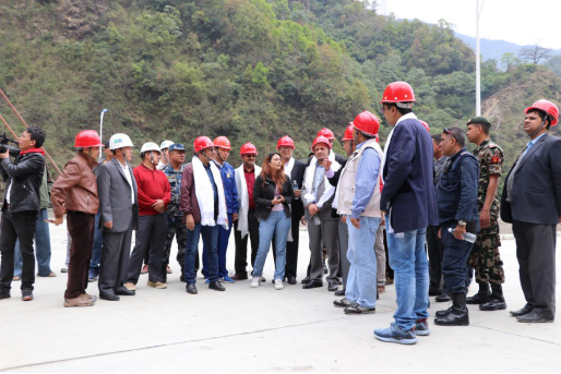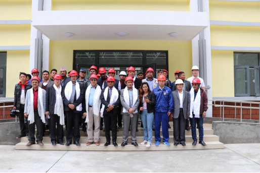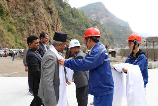 尼泊尔当地时间2019年4月9日,尼泊尔外交部部长、灾害治理工程委员会主席、国务秘书一行人莅临援尼泊尔塔托帕尼边检站灾后恢复项目现场,根据当地习俗,我现场管理组组长刘杰与施工技术组组长胡纪国一同给尼方代表献上哈达,对他们的到来表示热烈地欢迎,随后我管理组全体成员会同施工技术组陪同尼方代表视察项目建设情况。