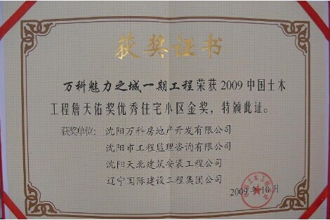 2009年10月,有全国二百多个项目参与中国土木工程詹天佑奖评奖,现已揭晓共评出中国土木工程詹天佑金奖8名,其中我公司监理的万科魅力之城一期工程荣获《优秀住宅小区金奖》,是沈阳市唯一获此荣誉的住宅小区项目,也是公司成立以来国优零的突破。这是我们万科魅力监理部的光荣,也是公司多年奋斗的结果。