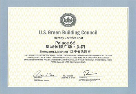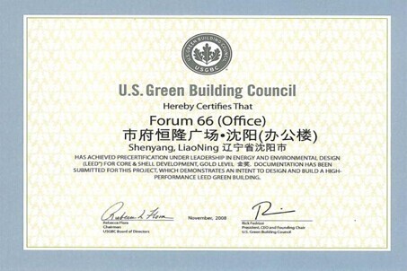 我公司监理的沈阳皇城恒隆广场(购物商场)和沈阳市府恒隆广场(购物商场及办公楼)喜获美国绿色建筑协会颁发的"能源及环境设计先锋奖 ─ 核心及外壳组别"金奖的认证。