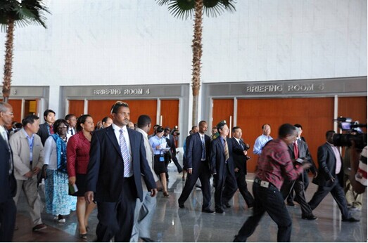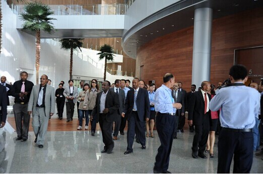 2012年1月11日下午16时,梅莱斯总理在非盟委员会主席让・平及多位非盟委员会委员、参建各方代表的陪同下参观了即将竣工的中国政府援建的非盟会议中心。在视察中庭、大会议厅、多功能厅、VIP会见厅、分组会议厅、非盟主席办公室后,他充满激情的说,新的非盟会议中心气势宏伟,设施完备,必定能够满足非盟目前和未来长期的办公需求。这一工程体现了中国和非盟的亲密伙伴关系,也预示着中非友谊将翻开新的篇章,中国和非洲将携手前行。