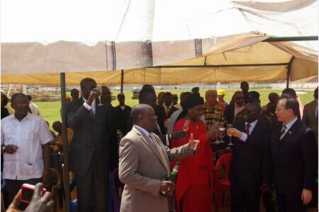 中几比宾主兴致勃勃为维修项目培土。按照几比当地风俗习惯,宾主打开了上好的香槟酒,共祝体育场维修项目进展顺利。