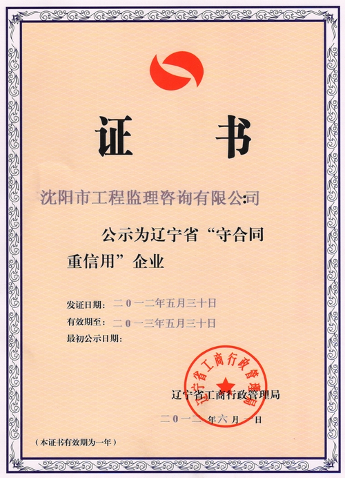 热烈祝贺沈阳监理2012年度再次荣获辽宁省“守合同、重信用”企业荣誉称号,这是我公司自2008年以来,连续5年获此殊荣。