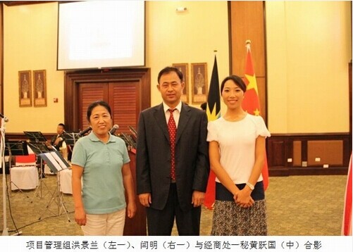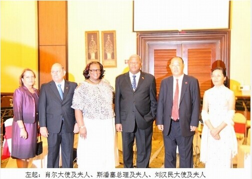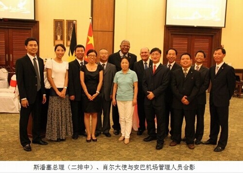 2012年9月3日晚19:00时,中国驻安巴使馆举行国庆招待会庆祝中华人民共和国成立63周年。安巴总理斯潘塞阁下、安巴非常驻中国大使肖尔阁下、中国驻安巴刘汉民大使、经商处黄跃国一秘、中国军乐团、安巴机场管理局代表及安巴各政要官员出席了招待会现场,中资企业代表、安巴项目管理组闫明、洪景兰、施工单位技术组长麻宗要等主要管理人员也应邀出席。