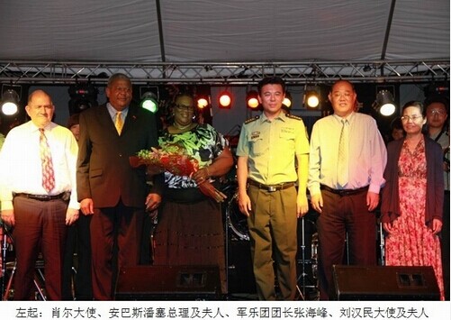 2012年9月2日晚,安巴机场项目部营地充满欢乐祥和的气氛,中外朋友欢聚一堂。20:00时在大家的翘首以盼中,中国军乐团18名演奏家开始了在安巴机场项目的专场演出。安巴总理斯潘塞阁下、安巴非常驻中国大使肖尔阁下、中国驻安巴刘汉民大使、经商处黄跃国一秘、安巴机场管理局代表出席了慰问演出现场,当地中资企业代表、项目当地合作伙伴和供应商代表等也应邀出席,安巴机场项目全体中外建设者总计200余人共同享受了这场精彩的音乐盛宴。