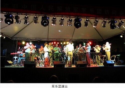 随后,军乐团的精彩演出在雄壮的中国人民解放军军歌《中国人民解放军进行曲》中拉开序幕。一首首悠扬的中外名曲激起了现场的中外友人的共鸣,全场掌声雷动,大家随着音乐共同歌唱的旋律久久飘荡在项目营地上空,辛勤工作了6个月的建设者们忘记了疲惫,听到了来自祖国的歌声,心中激动而温暖。伴随着迈克杰克逊的歌曲,肖尔大使夫人与军乐团演奏家的即兴舞蹈更是掀起了晚会的高潮。
