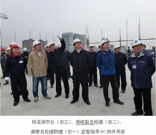 我公司副总经理焉峻、总经理助理(项目管理部经理、项目监理部总监)龚敬及项目相关人员陪同杨市长一行领导全程观看了整个吊装过程。随着首根PC构件柱的顺利起吊、就位,再到与传统工艺的完美对接,犹如一次接力传承,圆满成功。