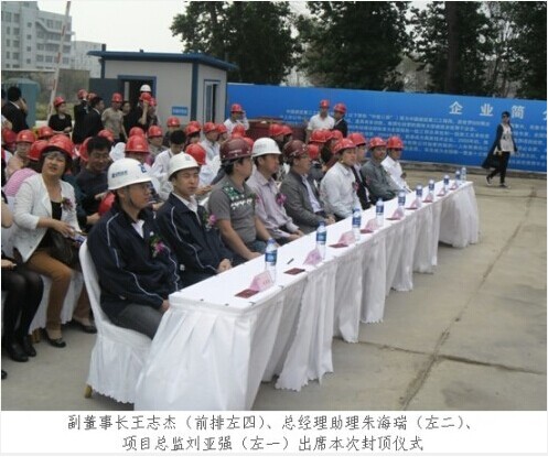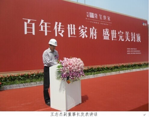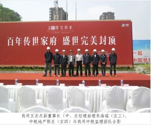 2013年5月19日上午10时,由我公司监理的中粮隆玺世家二期洋房项目主体工程封顶仪式如期举行。参建各方和新老业主齐聚中粮隆玺世家工程现场,庆祝二期洋房项目主体工程完美封顶。我公司副董事长王志杰、总经理助理朱海瑞、项目总监刘亚强出席了本次封顶仪式,王志杰副董事长发表了精彩讲话。