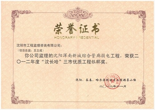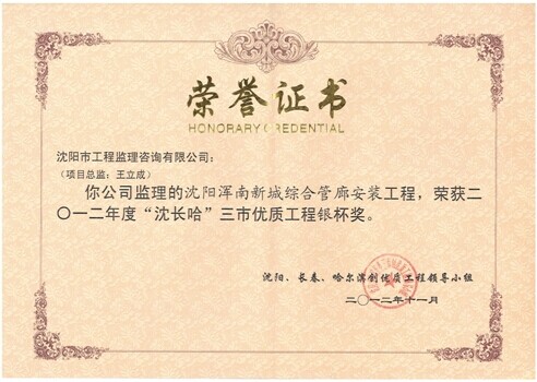 建设单位对我公司监理人员在工作中遵纪守法、爱岗敬业、团结协作的精神给予了肯定。我公司监理的沈阳浑南新城综合管廊安装工程和弱电工程,分别荣获二0一二年度“沈长哈”三市优质工程银杯奖。