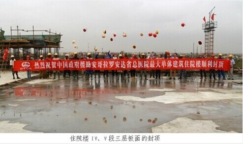 6月29日,我公司监理的援安哥拉罗安达省总医院维修改扩建项目现场横幅高挂,喜气洋洋。当地时间上午8时,随着最后一立方米混凝土的浇筑完成,该项目最大单体住院楼顺利实现封顶。这标志着援安医院主体结构施工取得了阶段性成果,为工程首次中期验收奠定了坚实的基础。