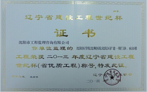 我司监理的沈阳医学院沈洲医院北院区扩建一期门诊、病房楼工程荣膺《二O 一三年度辽宁省建设工程世纪杯(省优质工程)》荣誉称号。辽宁省建设工程世纪杯是省建设工程质量最高荣誉奖项,由辽宁省建筑业协会每年评选一次,我公司沈阳医学院沈洲医院项目监理团队在创优活动中,将保证安全文明生产,创新质量、进度、投资控制管理模式、创优工程质量为宗旨,创造了省优质工程管理佳绩,为公司赢得了荣誉,为业主呈交了一份满意的答卷。