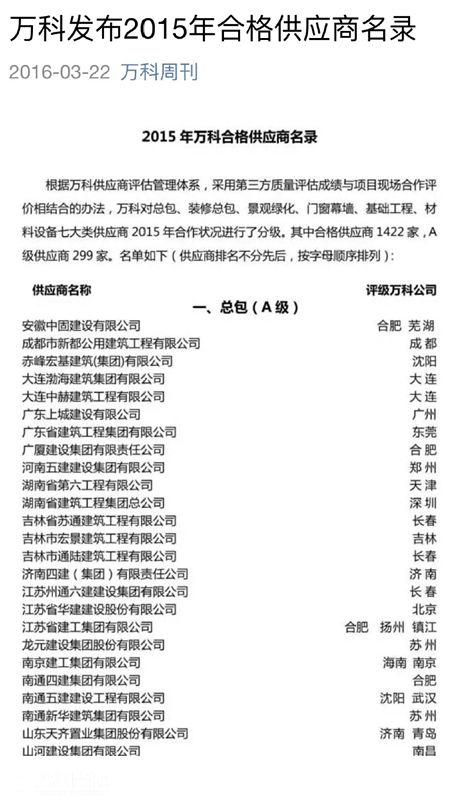 2016年3月22日,万科周刊发布《2015年万科合格供应商名录》。
