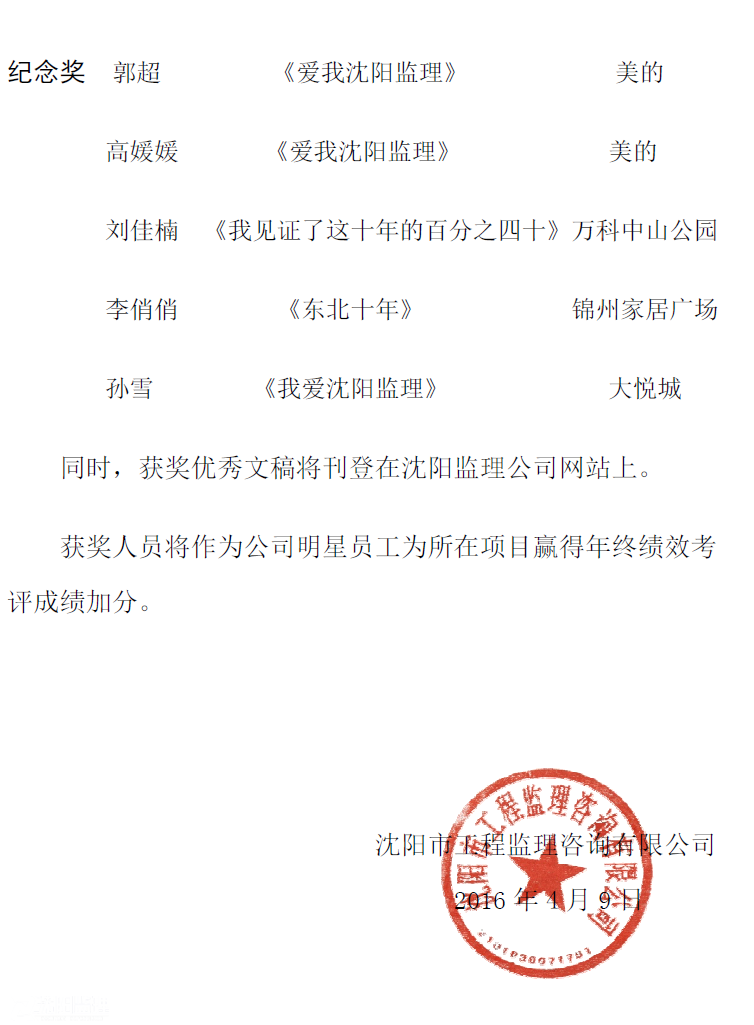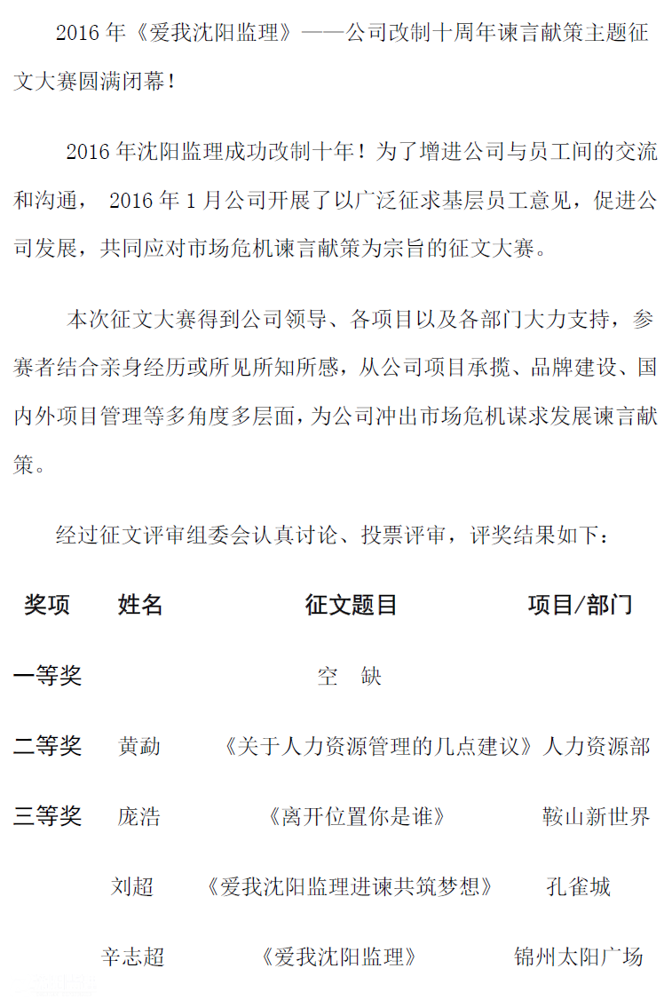 《爱我沈阳监理》—公司改制十周年谏言献策征文 大赛评奖结果公布