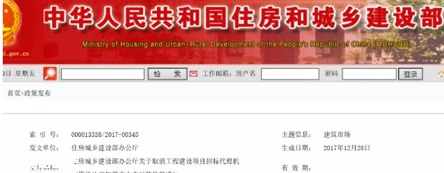 为贯彻落实《全国人民代表大会常务委员会关于修改<中华人民共和国招标投标法>、<中华人民共和国计量法>的决定》,住房城乡建设部办公厅近日下发通知,取消工程项目招标代理机构(以下简称“招标代理机构”)资格认定,深入推进工程建设领域“放管服”改革,加强招标代理机构事中事后监管,规范工程招标代理行为,维护建筑市场秩序。