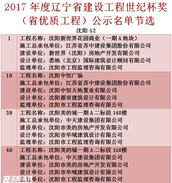 2017年度辽宁省建设工程世纪杯(省优质工程)由施工企业自愿申报,各市择优推荐,辽宁省建筑业协会工程质量管理分会组织专家组对工程复查并经省建设工程质量评审委员会审定,拟确定以下137项单位工程和4项住宅小区工程为辽宁省建设工程世纪杯。