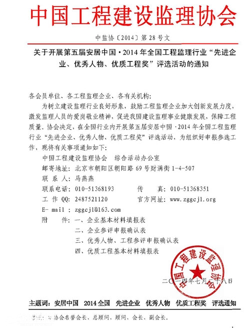 关于开展第五届安居中国·2014年全国工程监理行业“先进企业、优秀人物、优质工程奖”评选活动的通知
