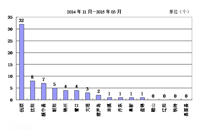 1.从查处违法工程的数量看,抚顺、沈阳、营口力度较大,5个月来平均每月分别查处9、5、3个以上违法工程;盘锦、大连数量较少,平均每月查处违法工程不足1个。