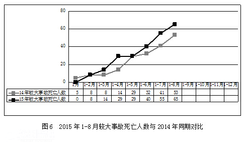 2015年1-8月,全国共发生房屋市政工程生产安全较大事故16起、死亡65人,与去年同期相比事故起数持平,死亡人数增加12人,同比上升22.64%(见图5、图6)。