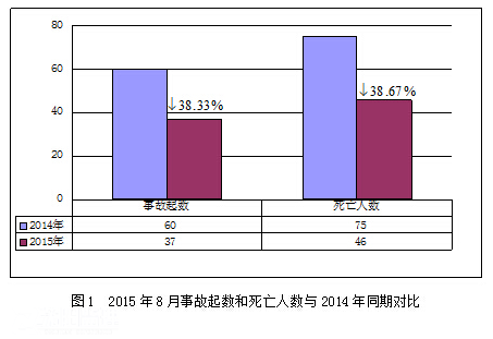 2015年8月,全国共发生房屋市政工程生产安全事故37起、死亡46人,比去年同期事故起数减少23起、死亡人数减少29人,同比分别下降38.33%和38.67%(见图1)。