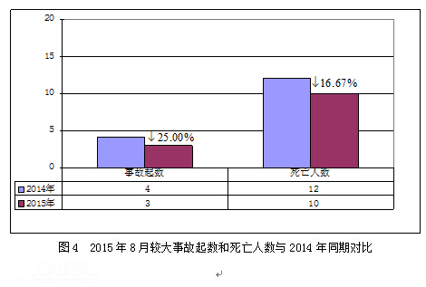 2015年8月,全国共发生房屋市政工程生产安全较大事故3起、死亡10人,比去年同期事故起数减少1起,死亡人数减少2人,同比分别下降25.00%和16.67%(见图4)。