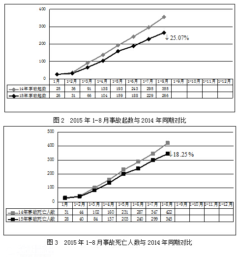 2015年1-8月,全国共发生房屋市政工程生产安全事故266起、死亡345人,比去年同期事故起数减少89起、死亡人数减少77人,同比分别下降25.07%和18.25%(见图2、图3)。