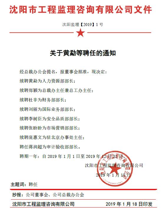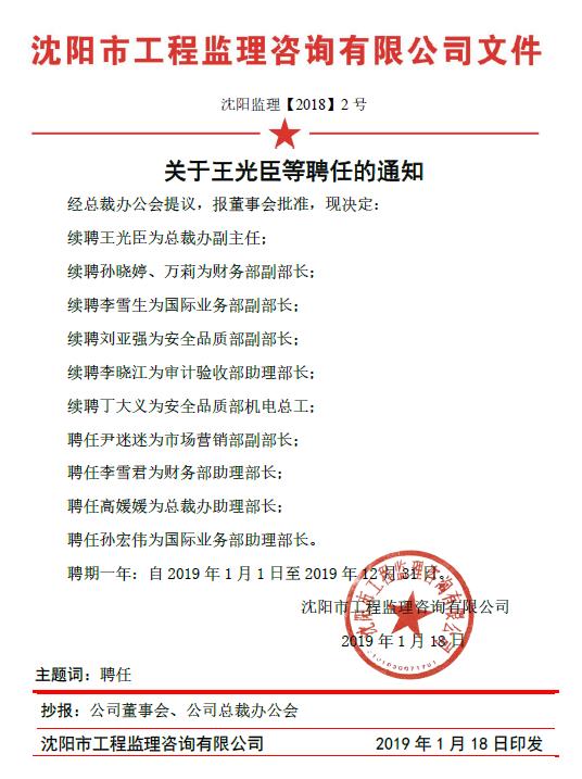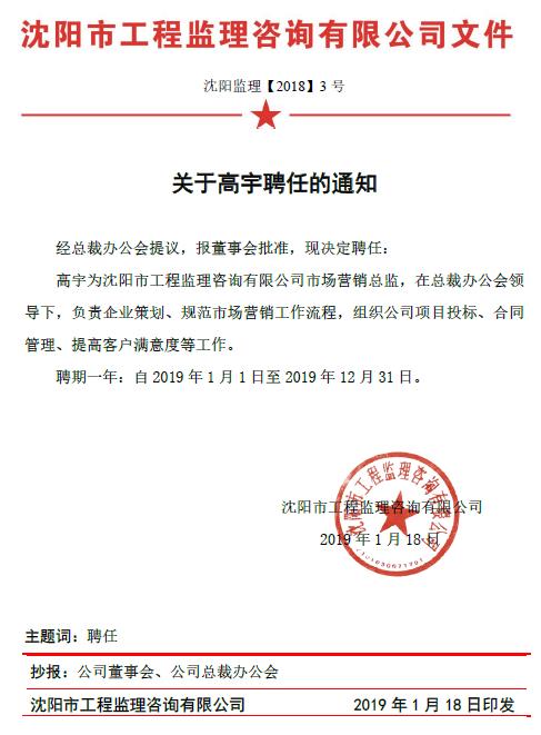 一、聘任高宇为沈阳市工程监理咨询有限公司市场营销总监,在总裁办公会领导下,负责企业策划、规范市场营销工作流程,组织公司项目投标、合同管理、提高客户满意度等工作。