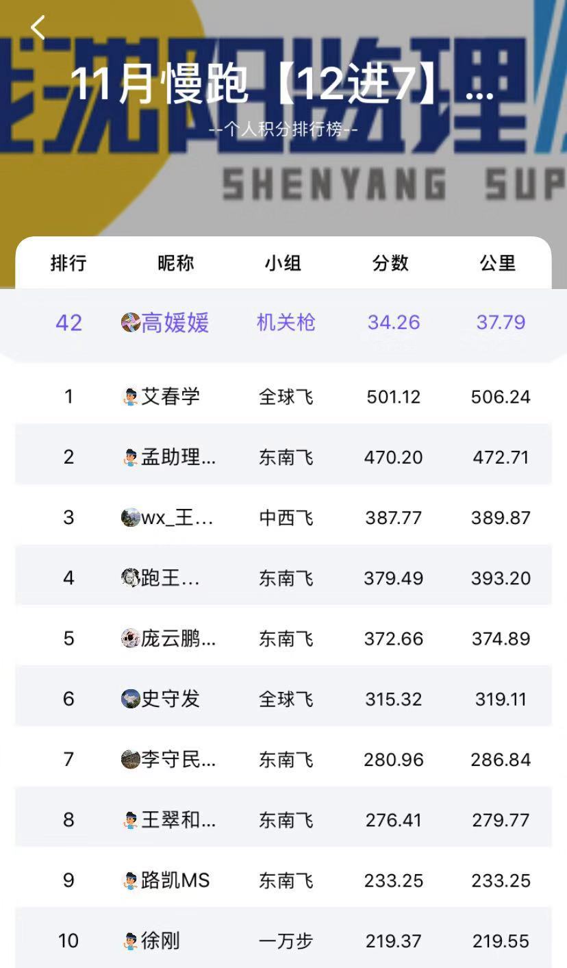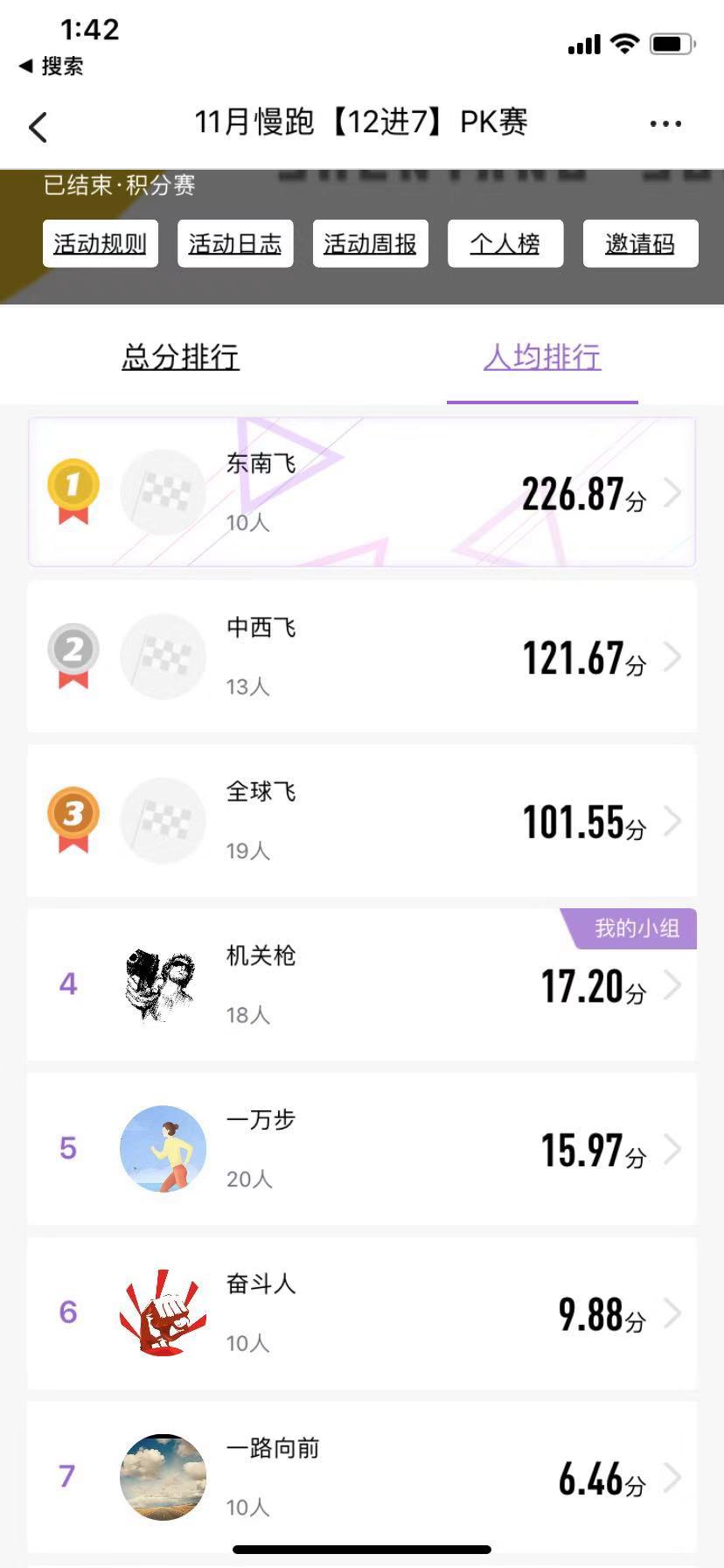 我们7只实力跑团为:东南飞、中西飞、全球飞、机关枪、一万步、奋斗人、一路向前;根据人均跑量排行“东南飞”获得了11月慢跑团队奖励,