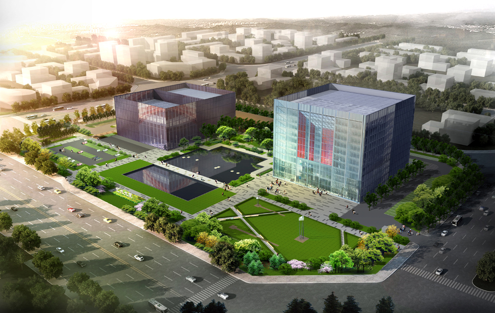 建筑形式上,剧团与机关采用高层集中式建筑形式,而规划布局则采用分散式,从而使基地内部得以空出大面积场地,广场的水面水位能够调节,春夏季有水时为浅水池,建筑仿佛浮在水面上,而秋冬季无水时,则可转换为供市民集会的硬质场地。
