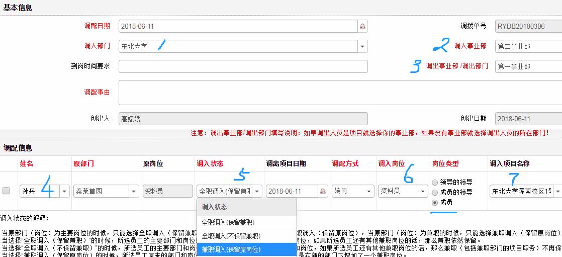 3、位置填写调入的人员原来在哪个事业部直接选择事业部