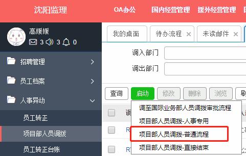 【人事管理】- 【人事异动】-【项目部人员调动】 进入页面后点击启动按钮。