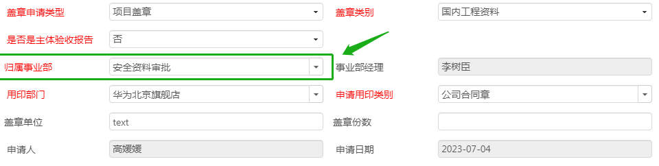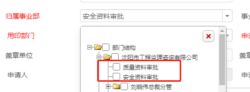 项目资料盖章,归属事业部位置安全类资料选择 “安全资料审批”(审批人为:李树臣)如图3所示,质量类资料选择“质量资料审批”(审批人为:那明暤)如图4所示
