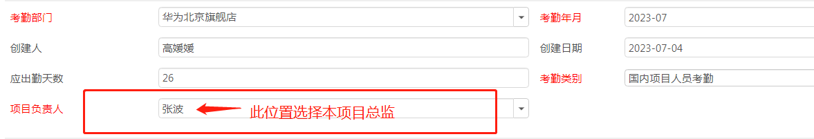 月度考勤申请中,选择考勤类别[国内项目人员考勤]后,项目负责人位置选择[所在项目总监],如图1所示。