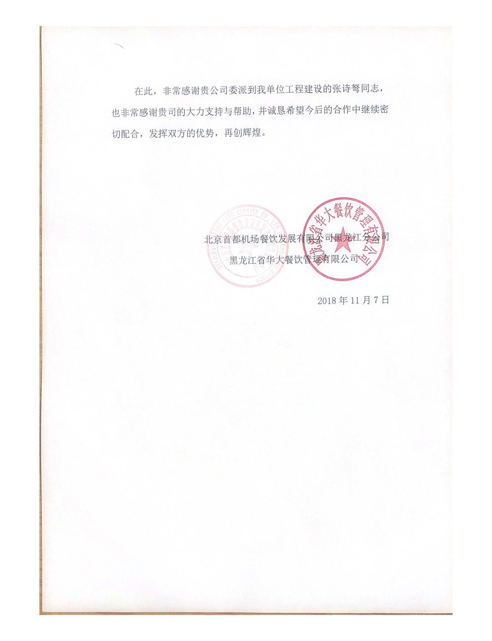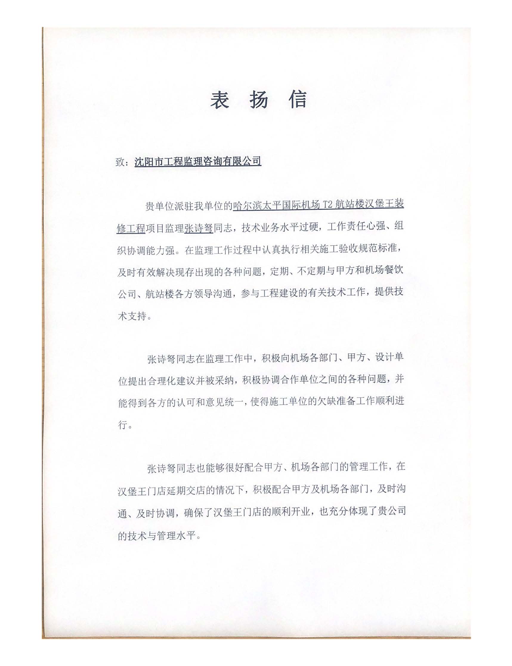近日,我公司第五事业部汉堡王项目张诗弩收到“哈尔滨太平国际机场T2航站楼汉堡王项目”的表扬信。信上,充分肯定了我司人员在施工监管期间的工作状态,对公司提供的优质服务表示感谢。